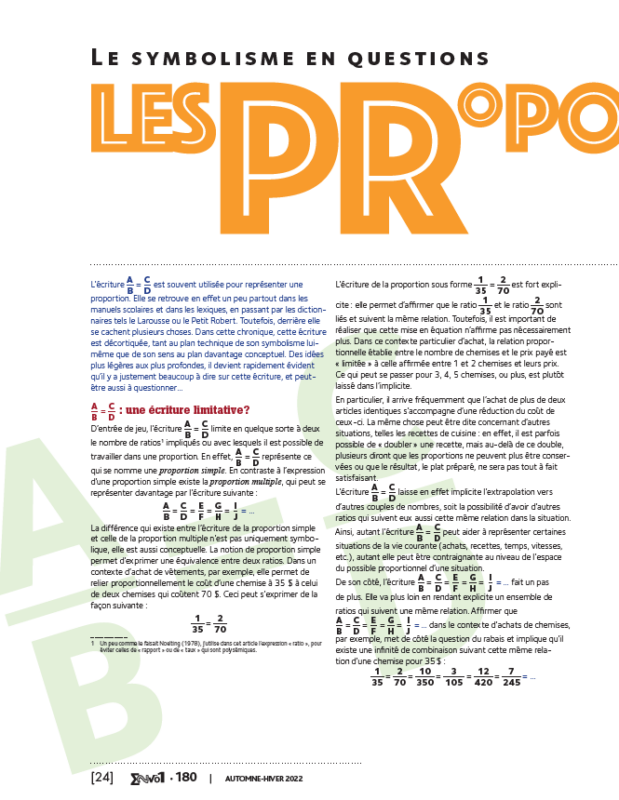 À noter que dans son article Le symbolisme en question – Les proportions (Revue Envol, 2022), M. Proulx utilise davantage l’expression ratio, puisque la distinction entre un rapport et un taux (bien que ce soit dans le programme et la PDA), n’est pas un élément clé du raisonnement proportionnel. En s’attardant à la relation entre deux quantités, cette préoccupation par rapport à la nature des quantités et le nom à leur attribuer est secondaire.